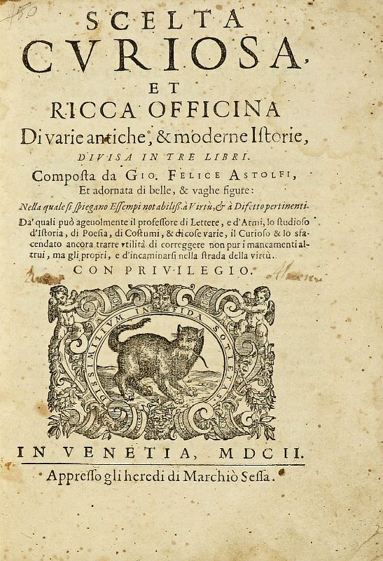 In-4° (mm 224x157), Pagine [24], 518, [2] bianche con belle vignette xilografiche incise a mezza pagina in principio di ciascun capitolo. Marca tipografica incisa in legno al frontespizio. Mancanza nel margine superiore della carta Q con piccola perdita di testo, alcune lievi fioriture marginali e occasionali macchioline, nel complesso buona copia. Legatura moderna in mezza pelle con piatti in carta decorata e titolo impresso in oro su tassello al dorso. Ex-libris di precedente proprietario al contropiatto anteriore.