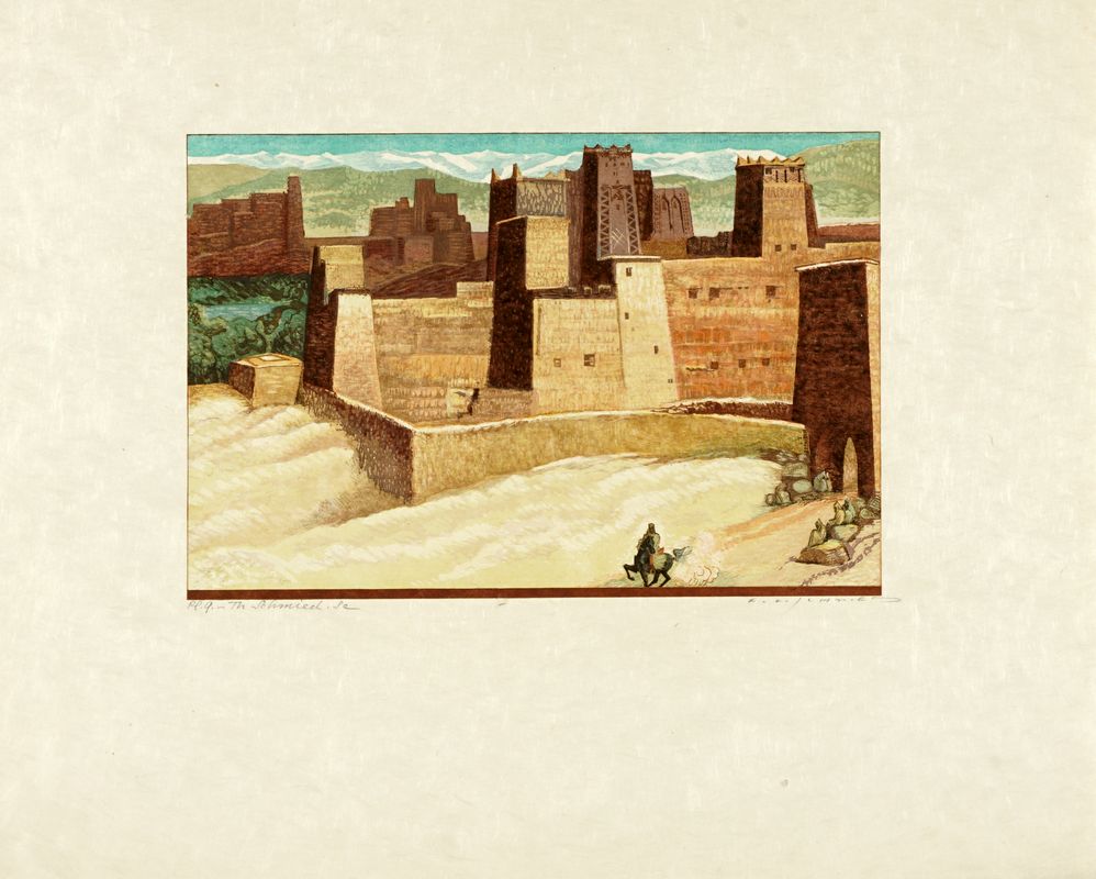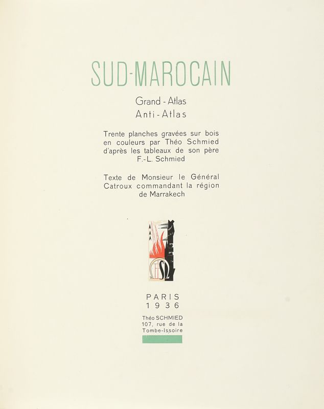 In-folio (mm 408x320). Esemplare a bifoli sciolti, con 30 splendide tavole a colori incise in legno su papier Japon nacré da Theo Schmied, dai quadri del padre François-Louis Schmied. Ad eccezione della n. 25 (Baigneurs dans le Haut Draa) firmata solo François-Louis Schmied, le tavole risultano tutte numerate in numeri arabi e firmate a matita dai due Artisti. Ciascuna è preceduta da un foglio sciolto, con titolo e numero. Rare fioriture alle tavole, altrimenti ottima copia. Brossura editoriale color panna, con titolo in rilievo su tassello verde al piatto anteriore, in ottimo stato di conservazione. Camicia e custidia in piena tela, con titolo su tassello di carta al dorso della prima. Fioriture sparse e altri minimi difetti. Uno dei 120 esemplari in numeri arabi, su una tiratura complessiva di 120 copie, firmate.