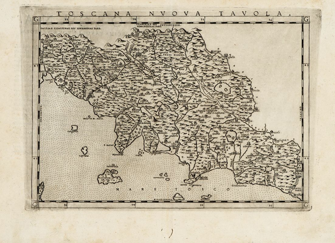 Incisione in rame. mm 183x264. Foglio: mm 228x312. Al verso del foglio il testo Toscana, / undecima tavola nuova d’Europa. Piccola mappa senza indicazioni tipografiche, tratta dall’opera di Claudio Tolomeo La Geografia [...] Nuovamente tradotta di Greco in Italiano, da Girolamo Ruscelli…, pubblicata per la prima volta a Venezia da Vincenzo Valgrisi nel 1561. L'opera ebbe larghissima diffusione e numerose edizioni: si deve a Valgrisi la ristampa del 1562, a Giordano Ziletti due edizioni nel 1564 e una nel 1574, ai fratelli Calignani quella del 1597, agli eredi di Melchior Sessa le due edizioni del 1598 e 1599. Dettagliata carta della Toscana, con graduazioni ai bordi, dal fiume Magra al Tevere fino a Ostia; ricca toponomastica con indicazione di fiumi, laghi e orografia; mare reso con brevi tratti, all'interno le varie isole tra le quali spicca l’Elba, di cui vengono indicati due soli toponimi: "Capoliue(ri)" e "S. Andrea".