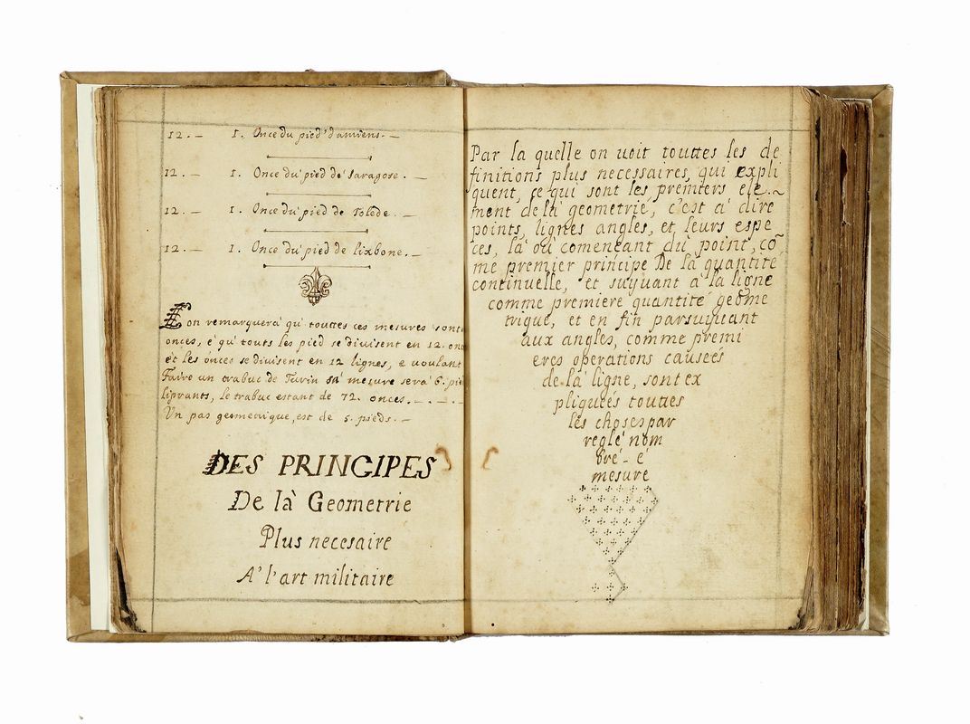 Manoscritto cartaceo a inchiostro bruno. Carte 260 scritte, 53 bianche (o marmorizzate). Testo in francese con moltissimi disegni in b/n e a colori (78 a piena pagina, 23 più piccoli e 3 tavole ripiegate). Angoli inferiori delle prime carte lievemente consumati non inficiano il testo; per il resto, stato di conservazione molto buono. Legatura non coeva, rigida, in piena pergamena. Dimensioni 150 x 110 mm.