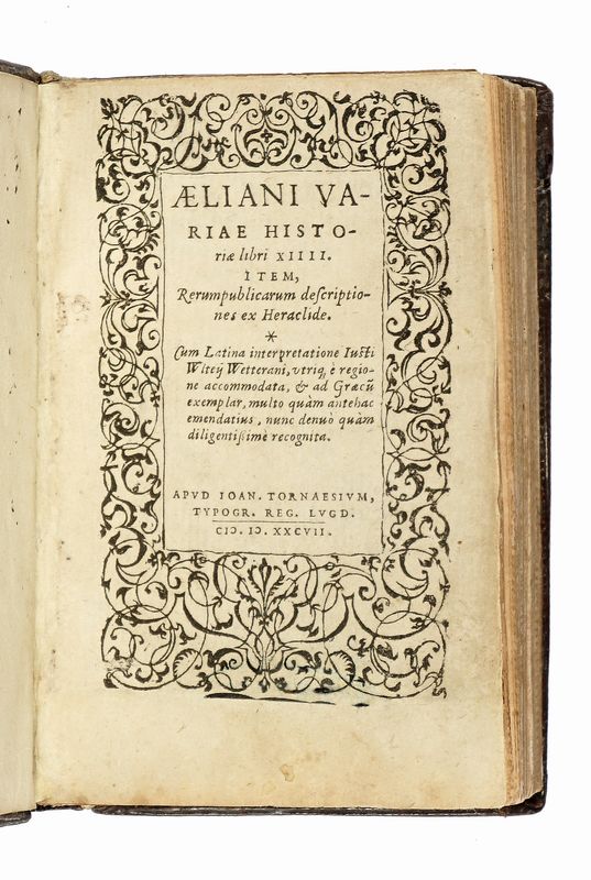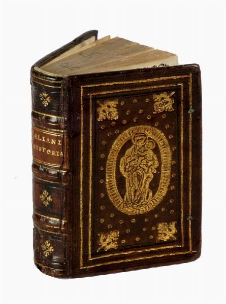 In-16° (mm 120x82). Pagine [16], 460, [20]. Frontespizio inquadrato entro cornice xilografica, iniziali e fregi in legno nel testo. Piccolo lavoro di tarlo nel margine superiore di poche carte (senza perdite), lieve e uniforme brunitura, ma buona copia, completa. Legatura coeva in pieno marocchino con cornici di filetti concentrici impressi a secco e in oro a ciascun piatto inquadranti raffigurazione (sempre impressa in oro) della Madonna col Bambino. Titolo in oro su tassello al dorso, tagli dorati. Ricostruito l'angolo superiore esterno del piatto posteriore, minime mancanze lungo il dorso, per il resto ottima conservazione.