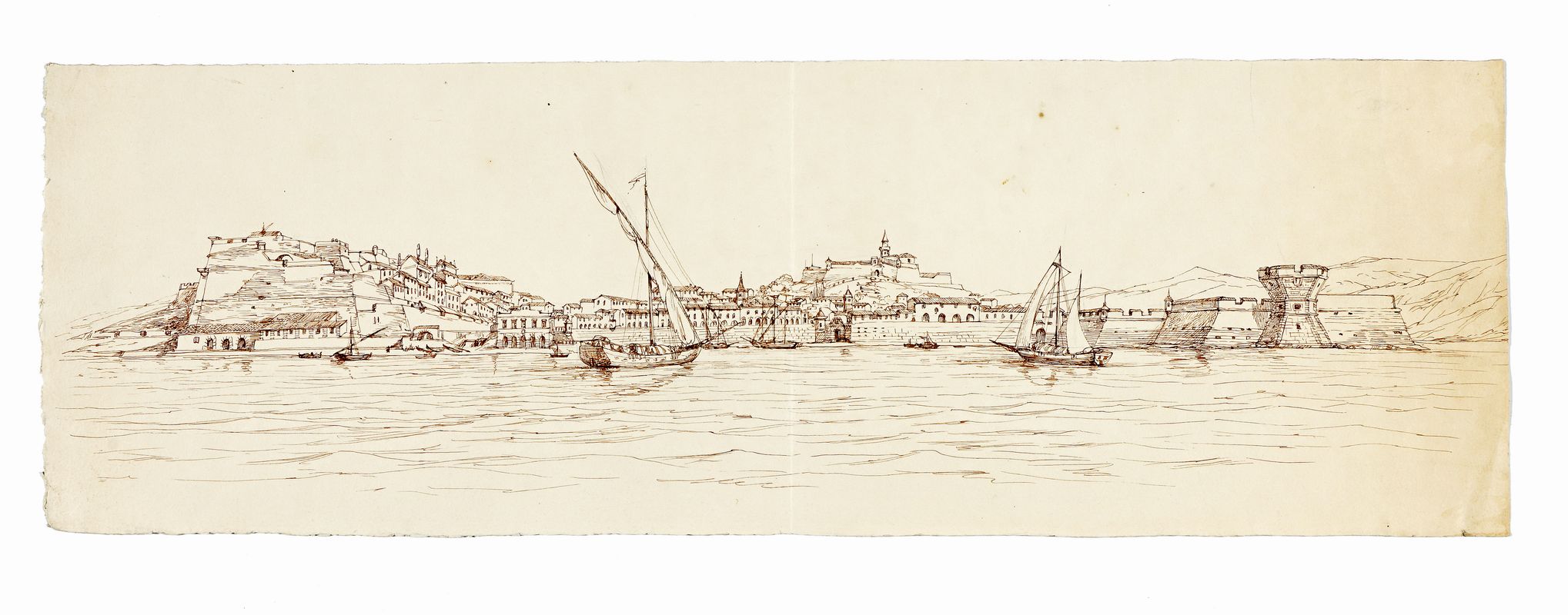Penna e inchiostro bruno su carta spessa non vergellata color crema. mm 190 x 600. Panorama della città preso dal mare, con due vascelli in primo piano e sullo sfondo a sinistra il Forte Falcone, il Forte Stella al centro e la torre della Linguella a destra.
