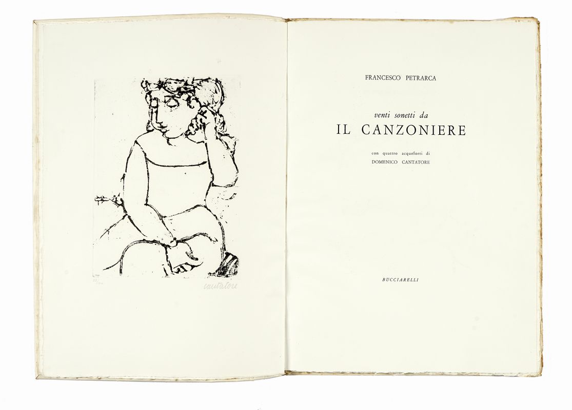 In-4° grande (mm 355x255). Ottimo esemplare in barbe, con 4 belle acqueforti di Domenico Cantatore piena pagina nel testo, di cui una in antiporta, tutte numerate a matita in basso a sinistra e firmate in basso a destra. Brossura originale in cartonato, con risvolti e titoli al piatto anteriore. Minime macchie.