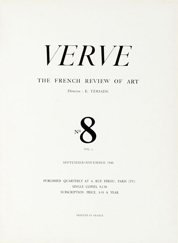 In-4° (mm 357x267). Con la litografia a doppia pagina Sunset over the Mediterranean di Pierre Bonnard, tirata da Mourlot Frères, e numerose riproduzioni a colori e in bianco e nero, anche a piena pagina, delle opere di Matisse, Rouault, Picasso, Braque, Derain e altri. Brossura editoriale con sovraccoperta illustrata dall'opera Symphonie Chromatique di Henri Matisse; plastica protettiva. Minimi segni di usura, ma nel complesso ottimo stato di conservazione.