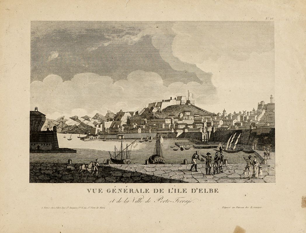 Acquaforte e acquatinta a colori. mm 304x425. Foglio: mm 387x504. Veduta della città sullo sfondo, e in primo piano la banchina del porto con gruppetti di popolani e due vascelli battenti bandiera francese. In basso, sotto il titolo, alcune informazioni sull’Elba e su Portoferraio, avvertendo che "c’est dans le chateau qui domine cette place que Buonaparte fait sa résidence". SI AGGIUNGE: Vue générale de l'île d’Elbe et de la Ville de Porto-Ferrajo. À Paris: chez Pillot, rue Saint Jacques, N° 6, au Saint nom de Marie, [1814]. Bulino. mm 205x260. Foglio: mm 243x310. Con il numero "26" in alto a destra. Veduta di Portoferraio connessa alle vicende napoleoniche. L’abitato è dominato dalle fortezze Falcone e Stella, sulla banchina del porto, in primo piano, è posizionato un gruppo di persone tra le quali è riconoscibile Napoleone di spalle.