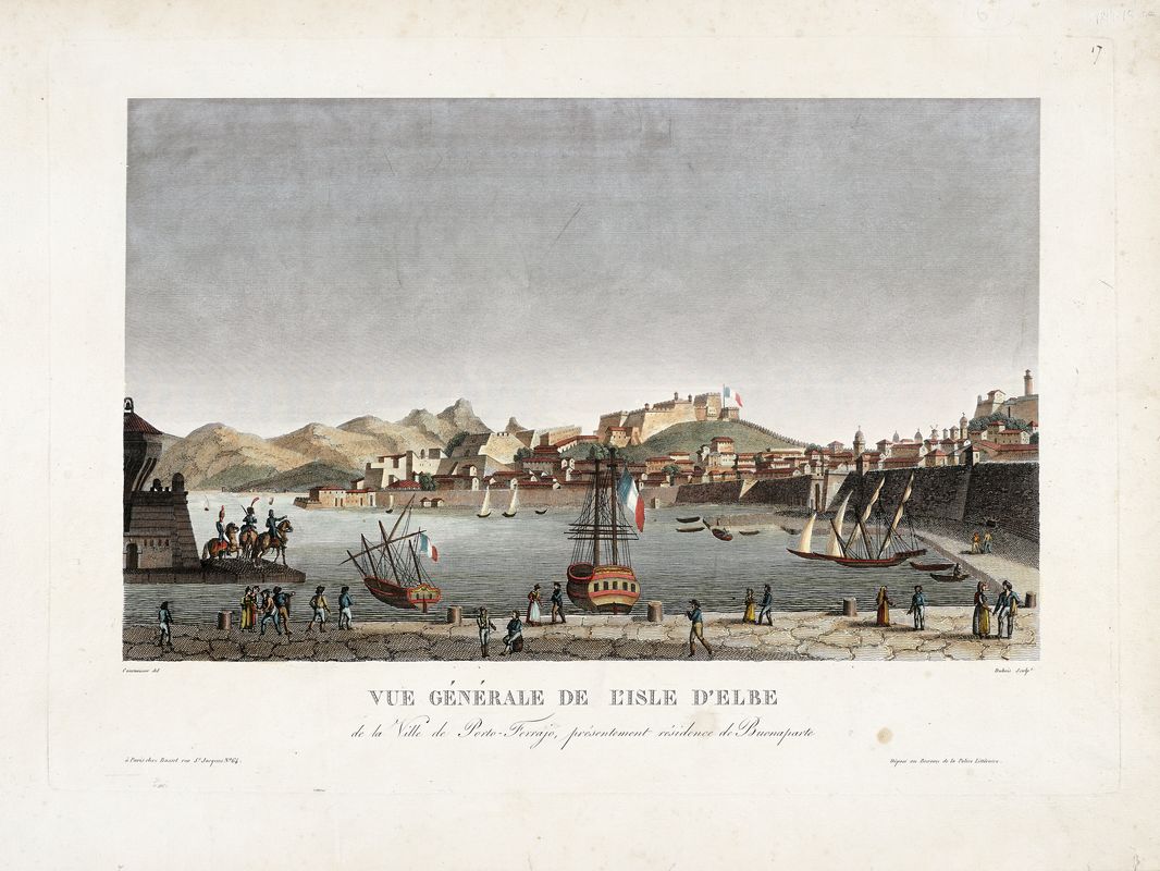 Acquaforte e bulino in coloritura. mm 330x475. Foglio: mm 405x560. Veduta panoramica con la città sullo sfondo, in primo piano la banchina del porto popolata di varie figure e due vascelli battenti bandiera francese. A sinistra, sul basamento della Linguella, vi sono tre cavalieri in alta uniforme, uno dei quali, col braccio teso a indicare la città, sembrerebbe lo stesso Napoleone.