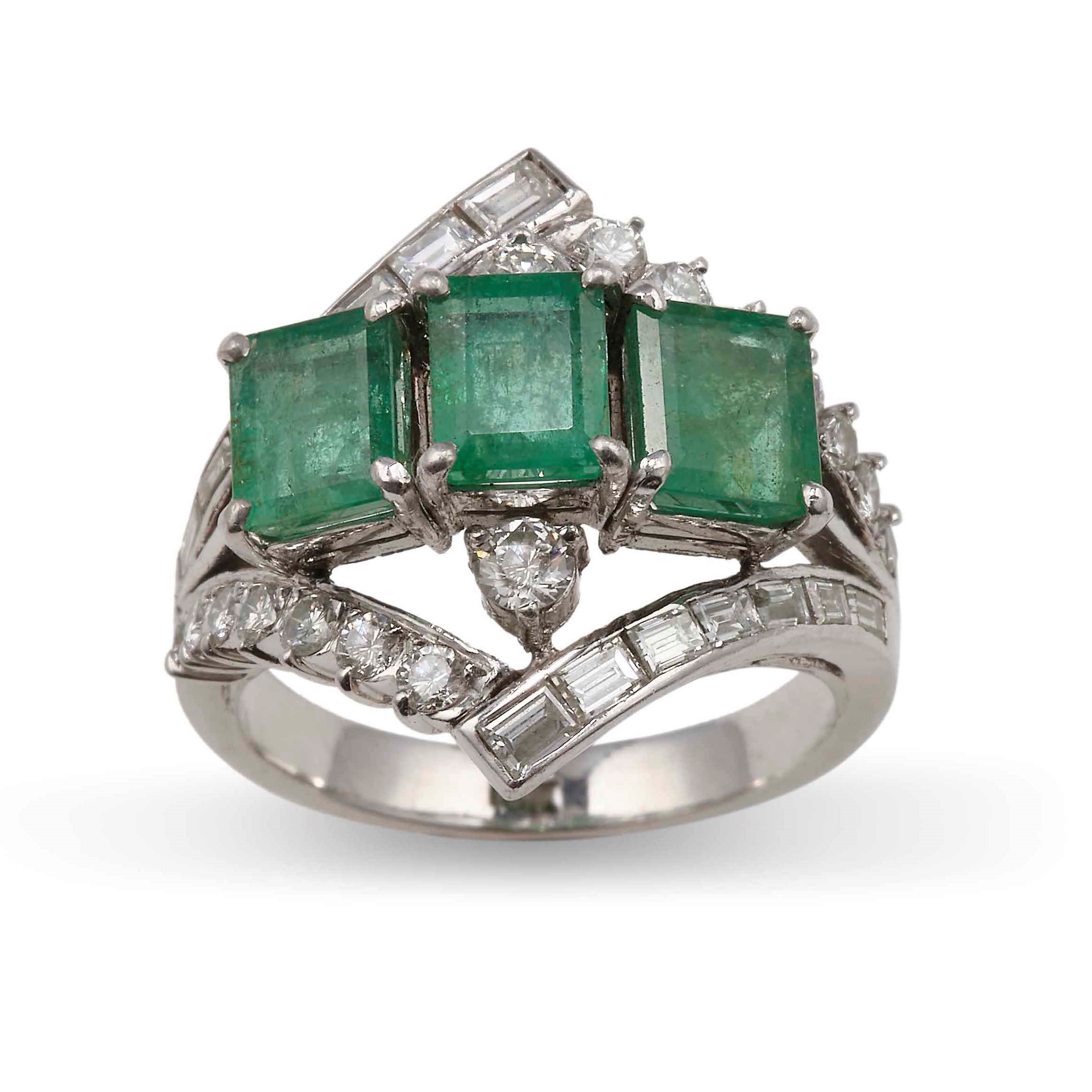 Anello con tre smeraldi Brasile di ct 0.60 circa l'uno e diamanti taglio brillante [..]