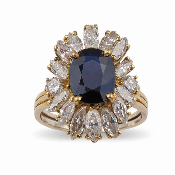 Anello con zaffiro Australia e diamanti taglio navetta e brillante a contorno