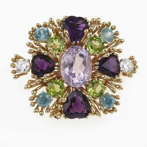 Spilla con gem-set, moissaniti sintetiche e kunzite centrale