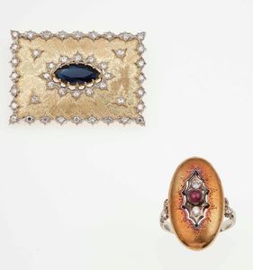 Lotto composto da anello con rubino e spilla con zaffiro