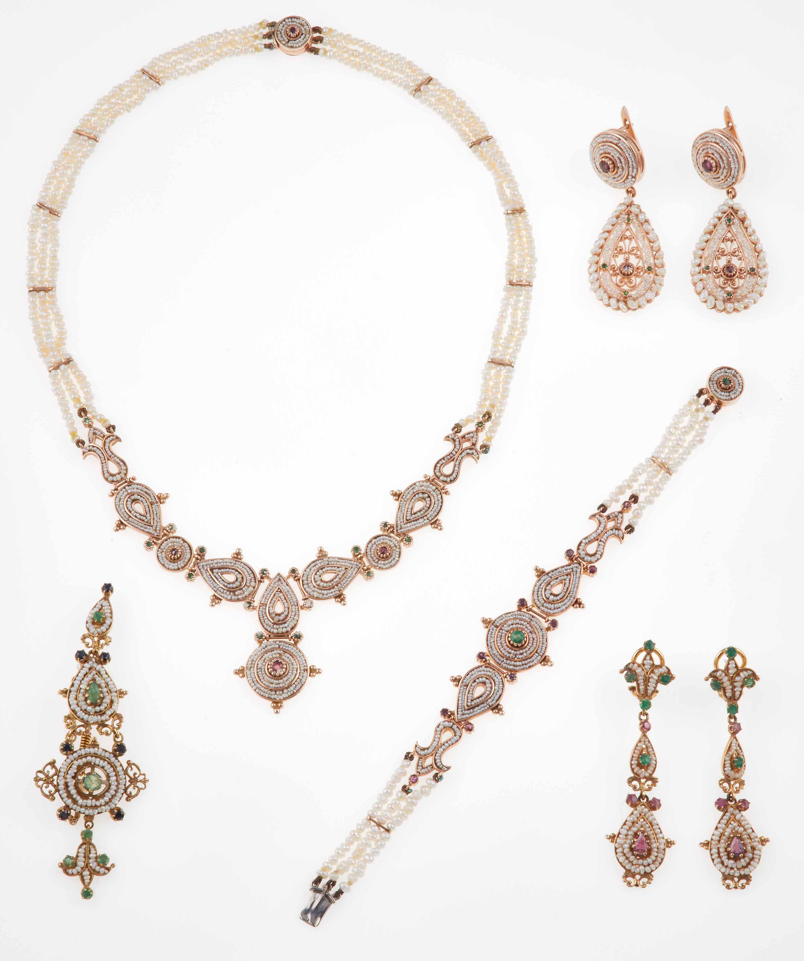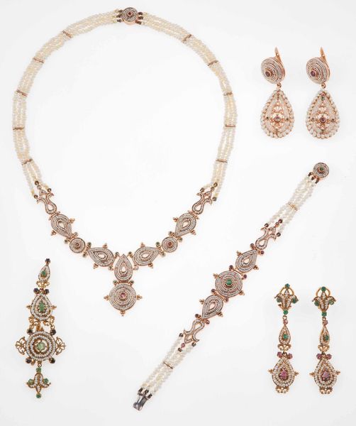 Lotto composto da girocollo, bracciale, spilla e due paia di orecchini con piccole [..]