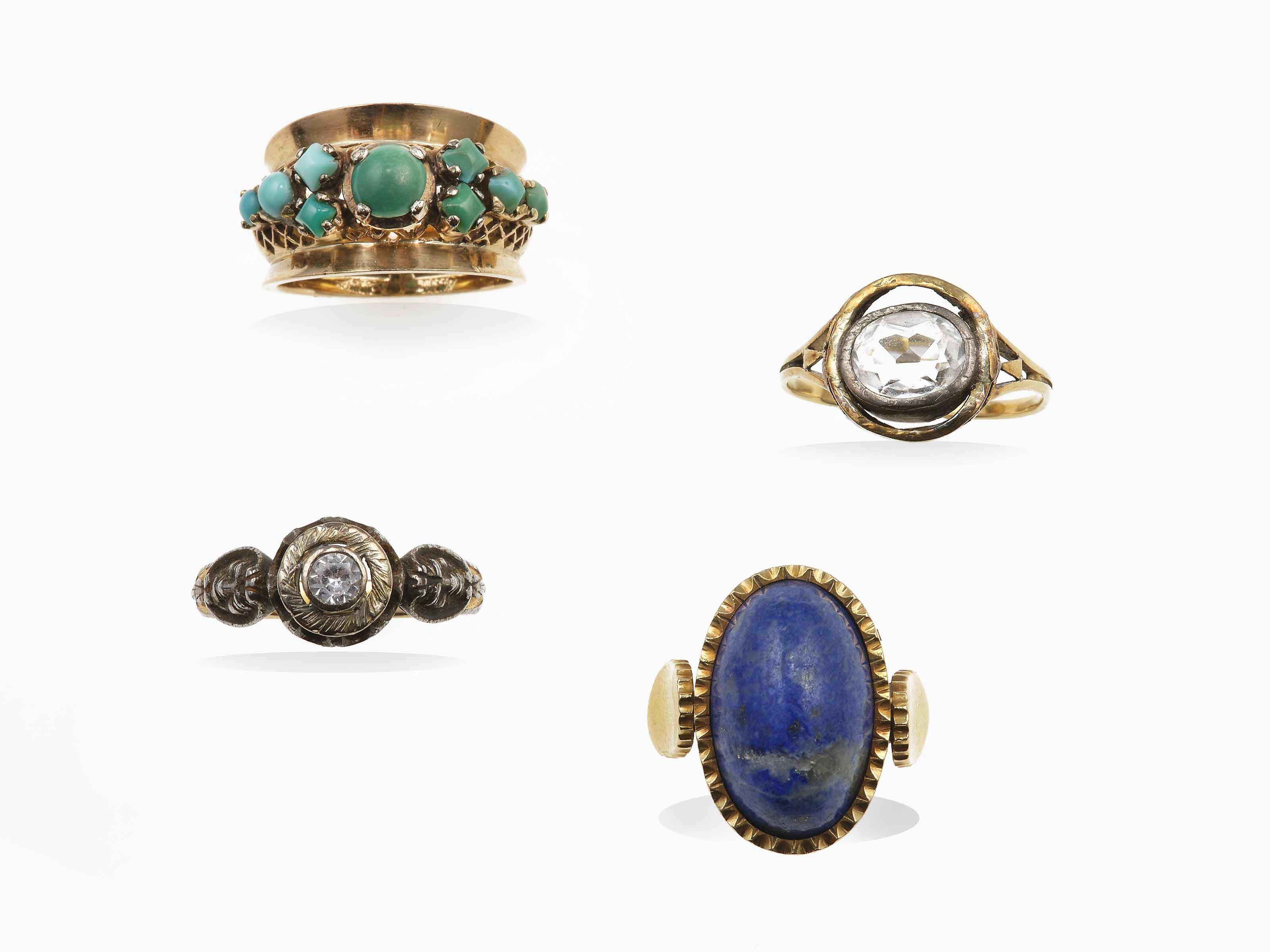 Lotto composto da quattro anelli con turchesi, lapislazzulo e vetri