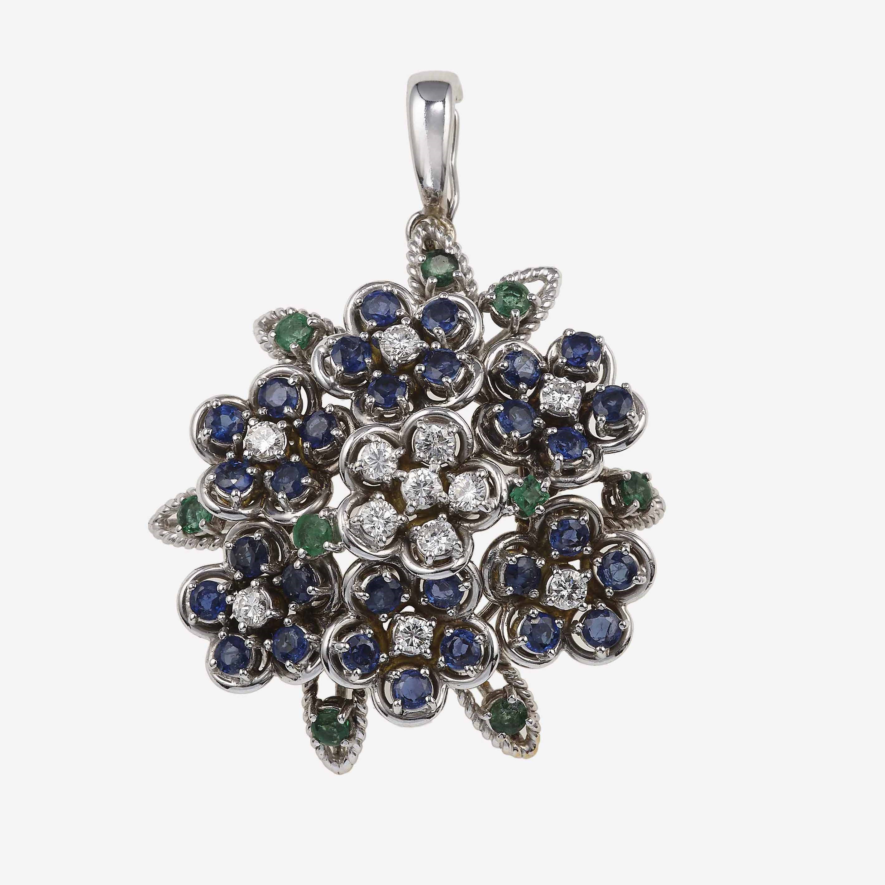 Spilla/pendente con zaffiri, smeraldi e diamanti