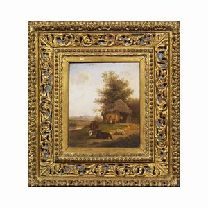 Scuola olandese, sec. XIX ARMENTI AL PASCOLO IN UN PAESAGGIO coppia di dipinti ad olio su tavola, cm 16,5x14 [..]