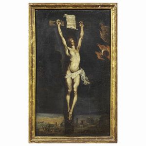 Scuola fiamminga, sec. XVII CROCIFISSIONE olio su tela, cm 61x36 Flemish school, 17th century CRUCIFIXION oil [..]