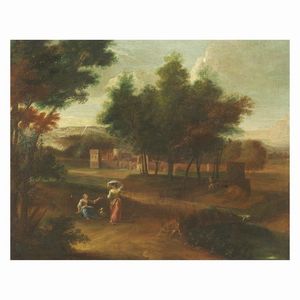 Scuola dell'Italia settentrionale, sec. XVIII PAESAGGIO CON FIGURE E GRANDE ALBERO SULLO SFONDO olio su tela, [..]