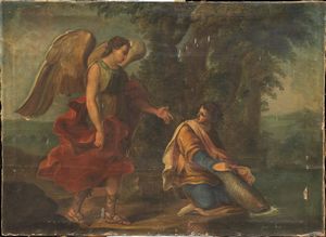 Scuola romana, sec. XVIII TOBIOLO E L'ANGELO olio su tela, cm 149,5x109 Roman school, 18th century TOBIAS AND [..]