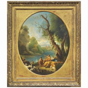 Scuola romana, sec. XIX PAESAGGIO ARCADICO olio su tela ovale, cm 69x57 Roman school, 19th century ARCADIAN [..]