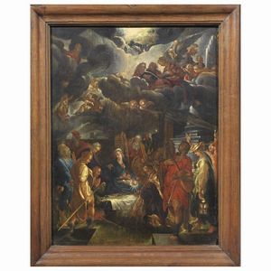 Scuola fiamminga sec. XVII ADORAZIONE DEI PASTORI olio su tavola, cm 62x55,5 Flemish school, 17th century THE [..]
