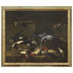 Scuola italiana, sec. XVII NATURE MORTE CON CACCIAGIONE coppia di dipinti ad olio su tela, cm 82,5x99 (2) Italian [..]