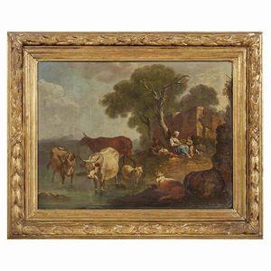 Scuola lombarda, seconda metà del sec. XVIII PAESAGGIO CON PASTORI E ARMENTI olio su cartone, cm 43x58 [..]