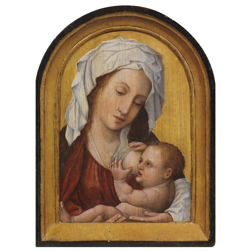 Ritroviamo nell’esemplare qui presentato, la stessa dolcezza e tipologia del modello di Memling, la medesima distribuzione dei volumi e la leggera inclinazione della madre verso il figlio aggrappato al suo seno, nonché lo stesso gusto arcaizzante per il fondo oro.