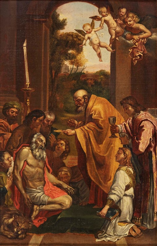 Il dipinto deriva dal quadro eseguito da Domenico Zampieri, detto il Domenichino, nel 1614, conservato presso la Pinacoteca dei Musei Vaticani di Roma.