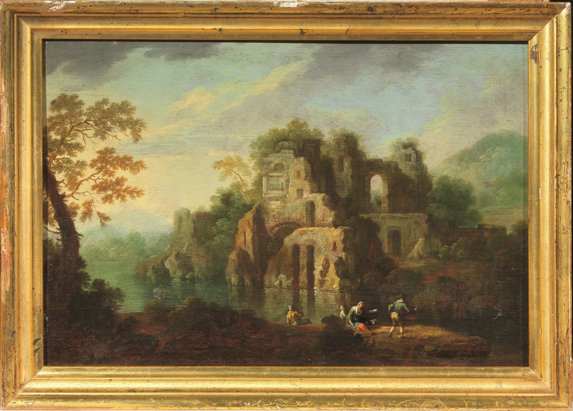 RIVER LANDSCAPE WITH RUINS AND FIGURES
