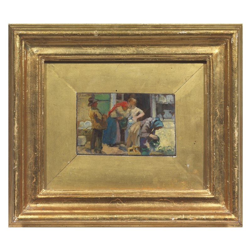 Filippo Marfori Savini (Urbania 1877 - Firenze 1952) LA VENDITRICE DI COCCI olio su compensato, cm 7x11,5 firmato in alto a sinistra retro: dedicato al professor Marri in segno di riconoscimento, Olinto Lombardi e datato 1.6.933-XI