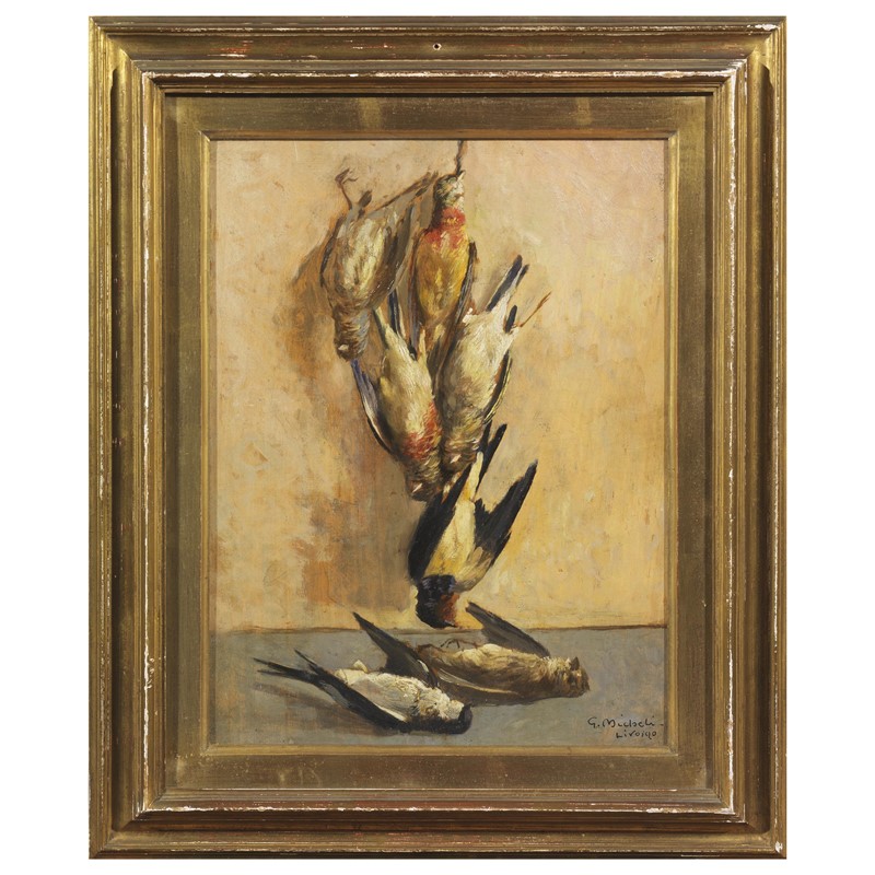 Guglielmo Micheli (Livorno 1866 - Livorno 1926) NATURA MORTA CON UCCELLI olio su tavola, cm 43,5x.32,5 firmato e iscritto Livorno in basso a destra retro: iscritto Opera autentica di mio padre/ Gino Mario Micheli