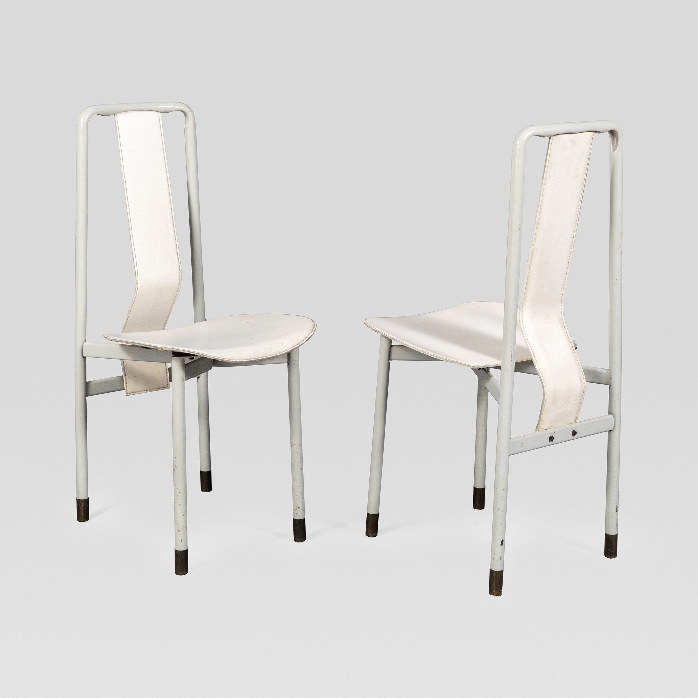 Italia, anni 70 sei sedie mod. Irma in acciaio verniciato, ottone e pelle, difetti