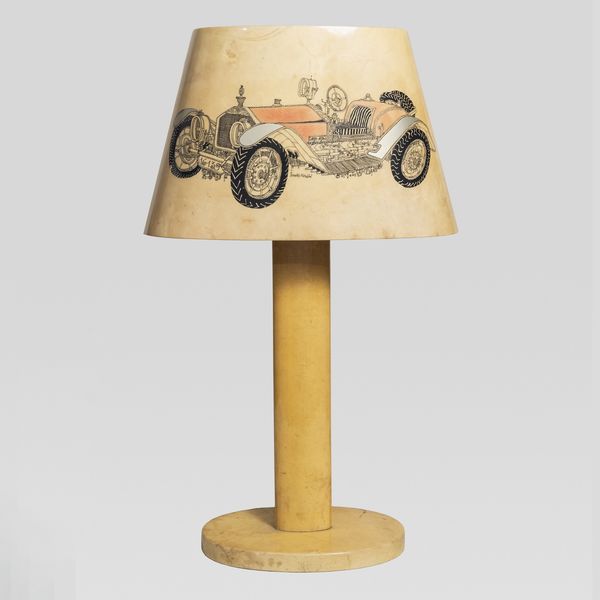 Italia, anni 70 lampada da tavolo in legno rivestito in pergamena, paralume dipinto, firmata