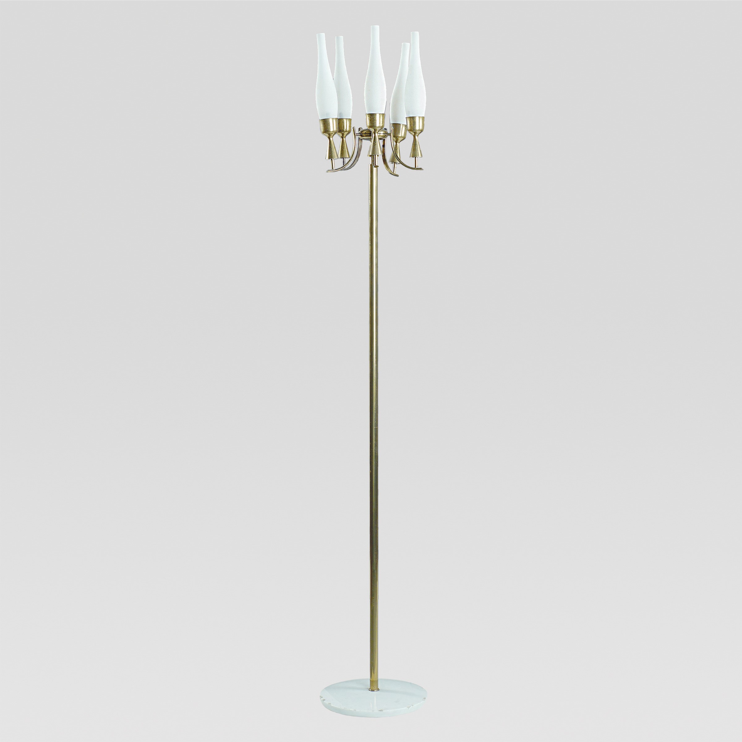 Italia, 1957 circa lampada da terra in ottone, diffusori in vetro opalino bianco, base in marmo