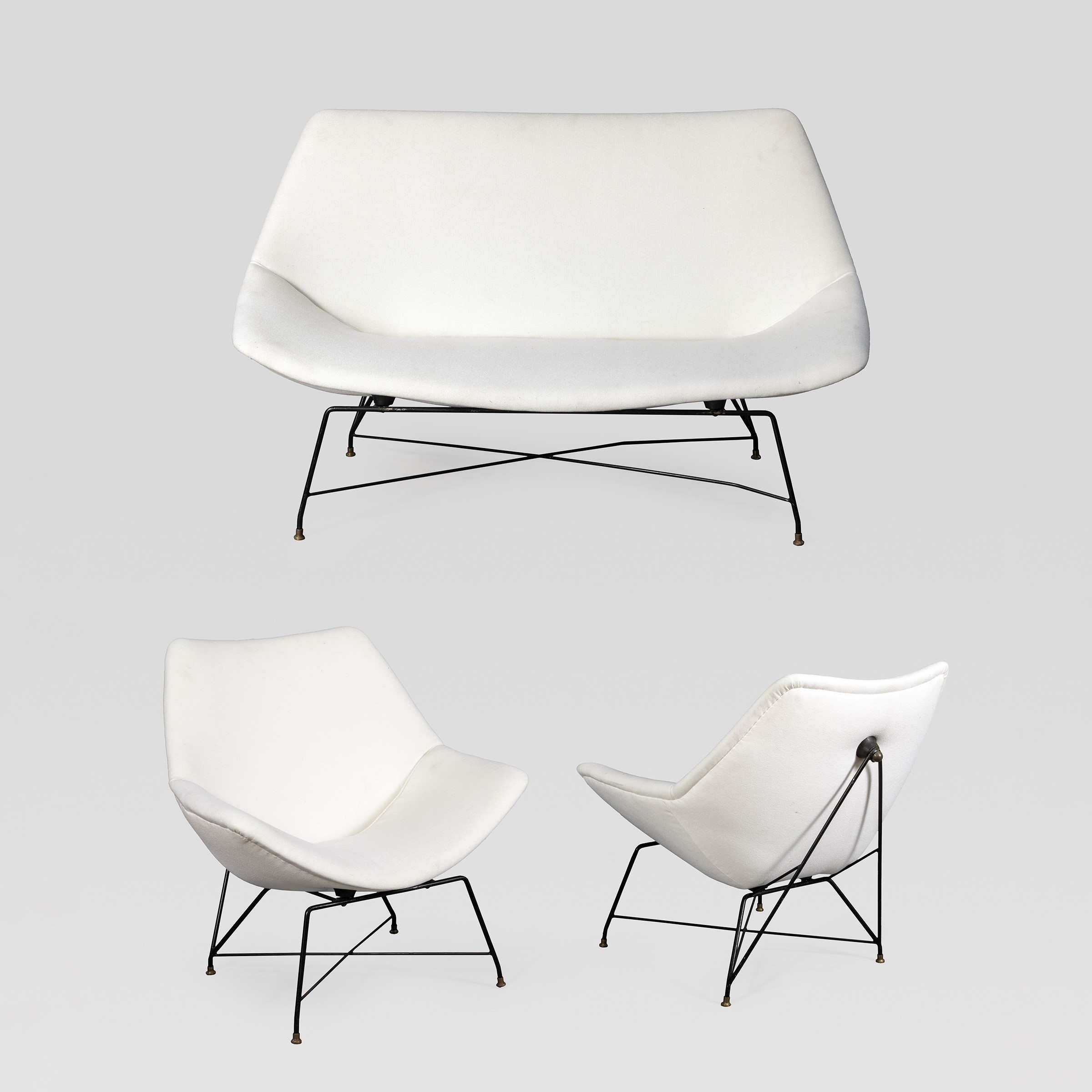 divano 86x143x70 cm. - poltrona 84x81x76 cm. Italia, anni 50 salotto mod. Kosmos composto da un divano e due poltrone in metallo verniciato, ottone e tessuto imbottito Bibliografia: Domus 324 (novembre 1956); rassegna catalogo Fratelli Saporiti 1959, pagine non numerate.