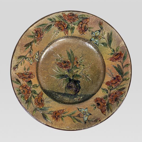 Faenza, anni 50-60 piatto in ceramica policroma raffigurante vaso di fiori, marchio della produzione