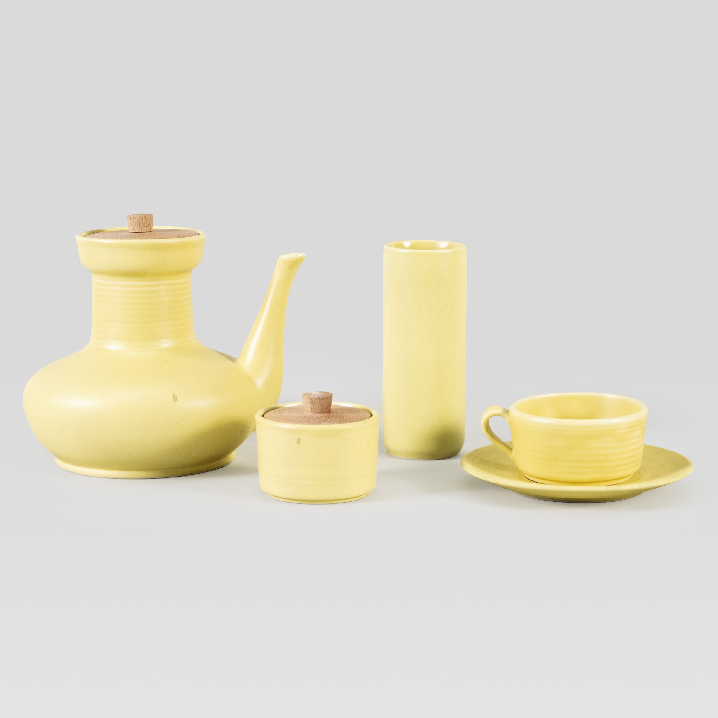 Italia, anni 50 servizio in ceramica composto da 10 tazze da the con piattini, una teiera, una zuccheriera e 6 bicchieri da bibita, marchio ed etichetta della produzione