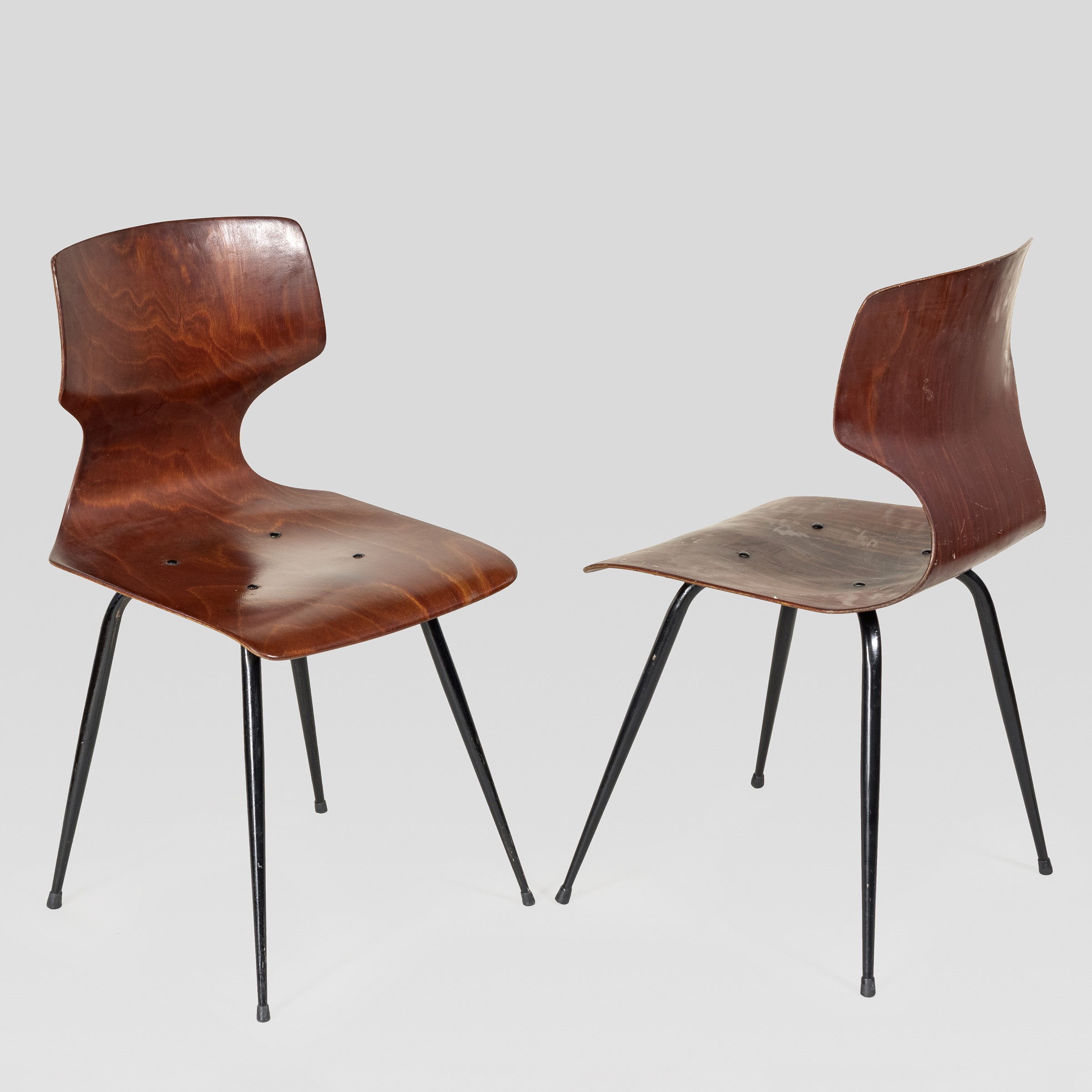 Germania, anni 60 quattro sedie impilabili in legno e metallo verniciato, marchio della produzione