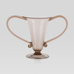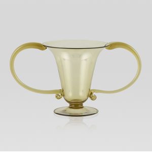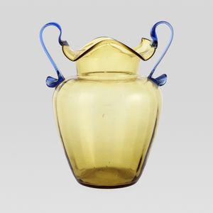 27x23x18 cm. Italia, XX Sec. vaso a due manici in vetro soffiato ambra e azzurro