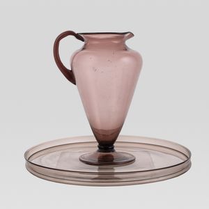 caraffa h. 26 cm. -vassoio d. 34,5 cm. anni 30-40 caraffa con vassoio circolare in vetro soffiato colorato