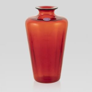 h. 17 cm. Murano, 2002 piccolo vaso in vetro soffiato rosso, firma a punta, etichetta della produzione