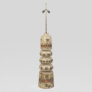 h. 156 cm. anni 50-60 lampada da terra Totem in ceramica policroma ed ottone, siglata A.S.