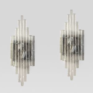 49x17x9,5 cm. Murano, anni 50-60 coppia di lampade da parete serie Linea in vetro trasparente e acciaio