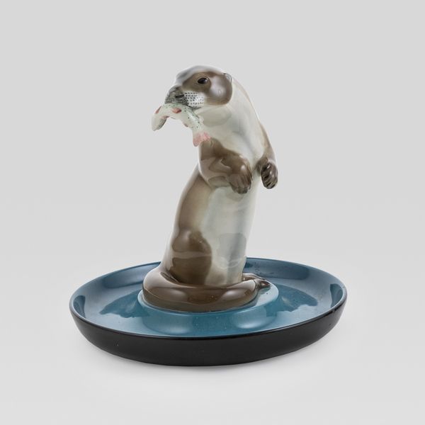 Torino anni 30-40 scultura lontra con pesce su piatto in ceramica policroma smaltata, marchio delle produzione, lievi difetti