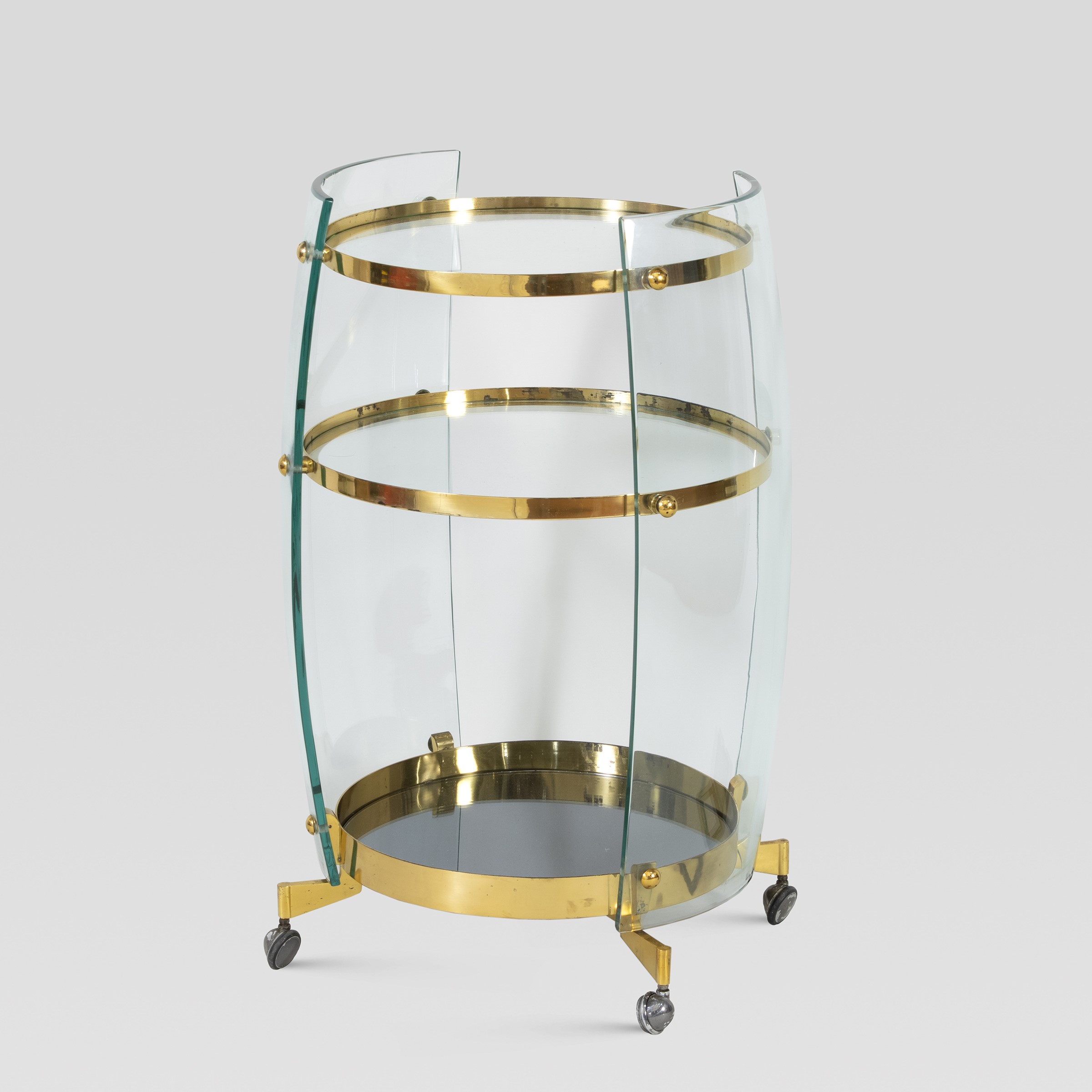 Italia, anni 50 carrello in ottone e vetro curvato, difetti