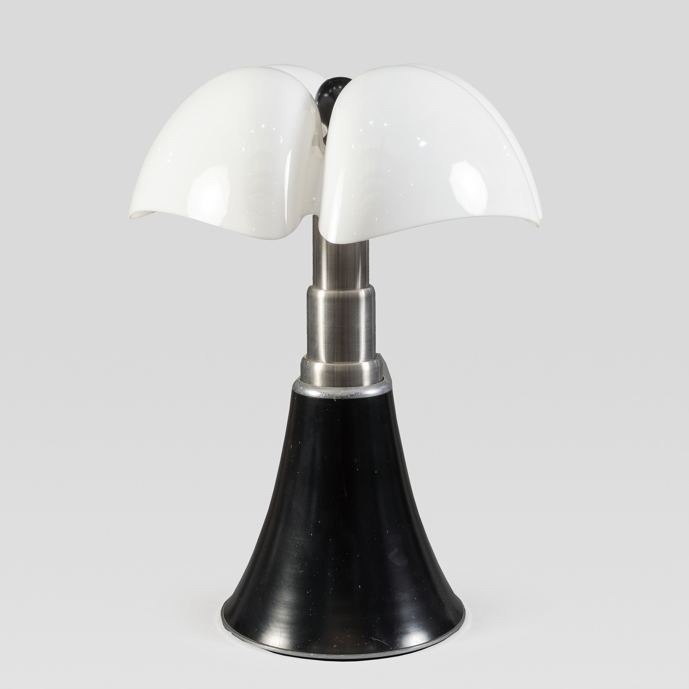 Italia, anni 60 lampada da tavolo mod. Pipistrello, diffusore in metacrilato opalino, telescopio in acciaio inox, base a pomello in metallo verniciato, etichetta della produzione, difetti