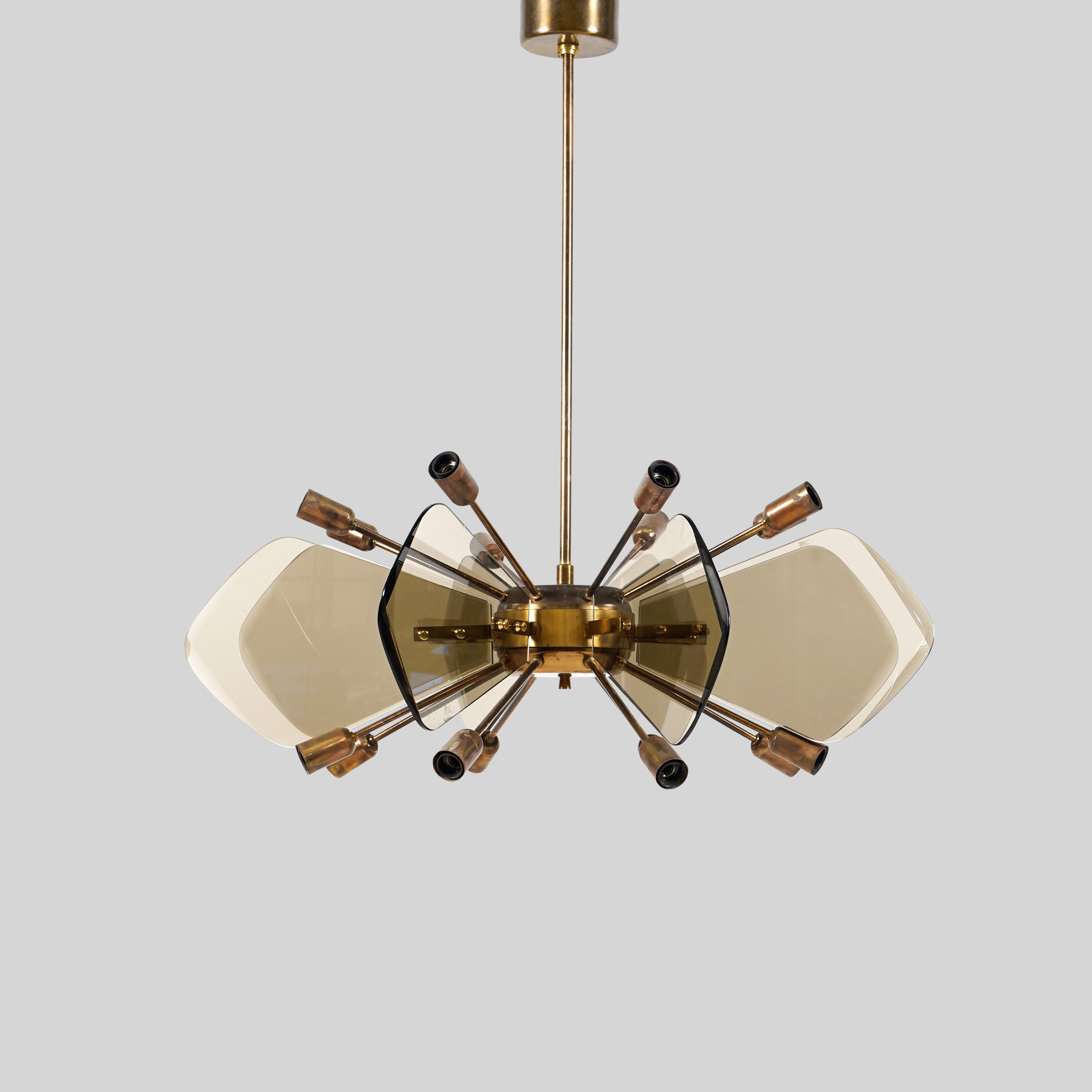Italia, anni 60 lampada a sospensione in ottone e vetro fumè