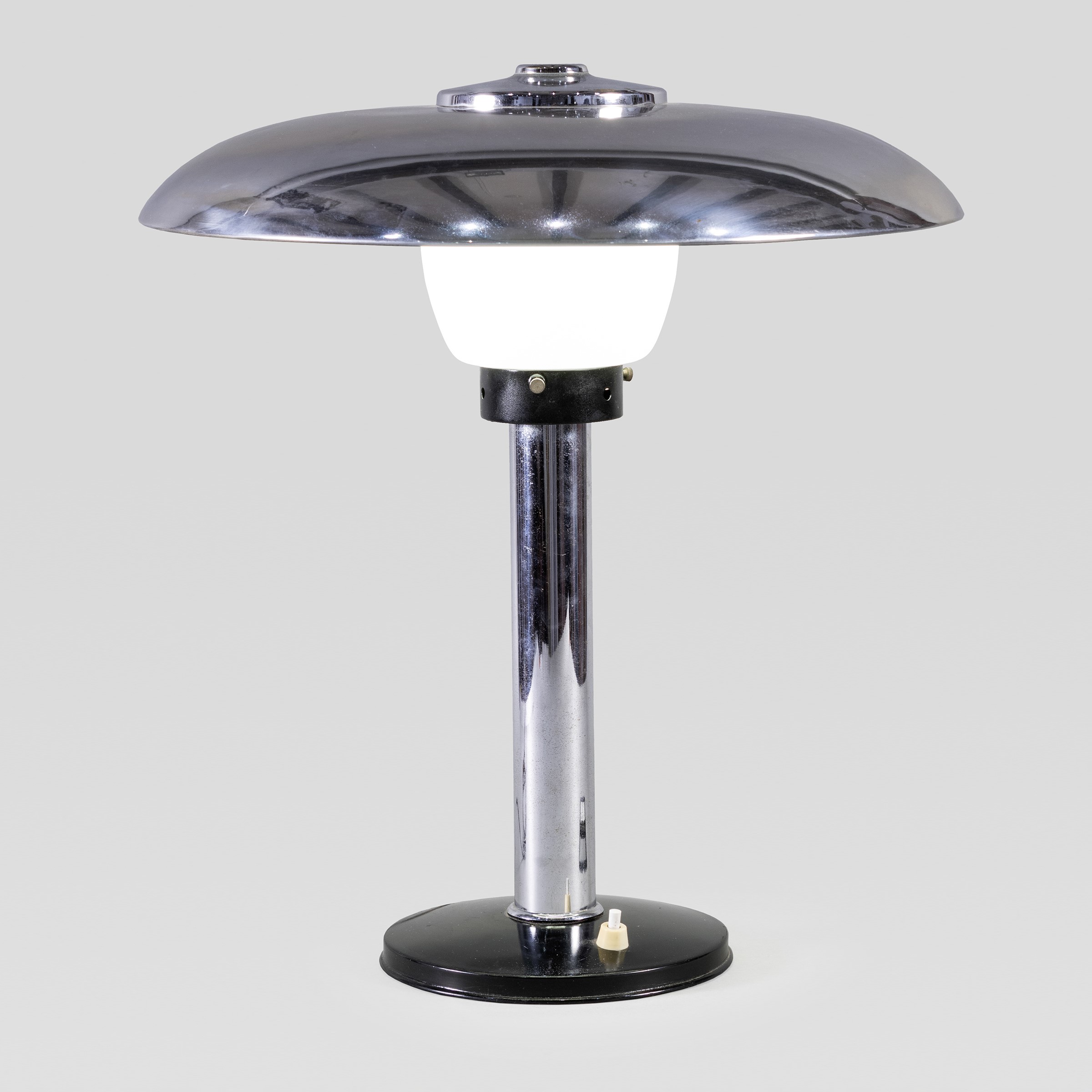 Italia, anni 50 lampada da tavolo in metallo cromato e vetro