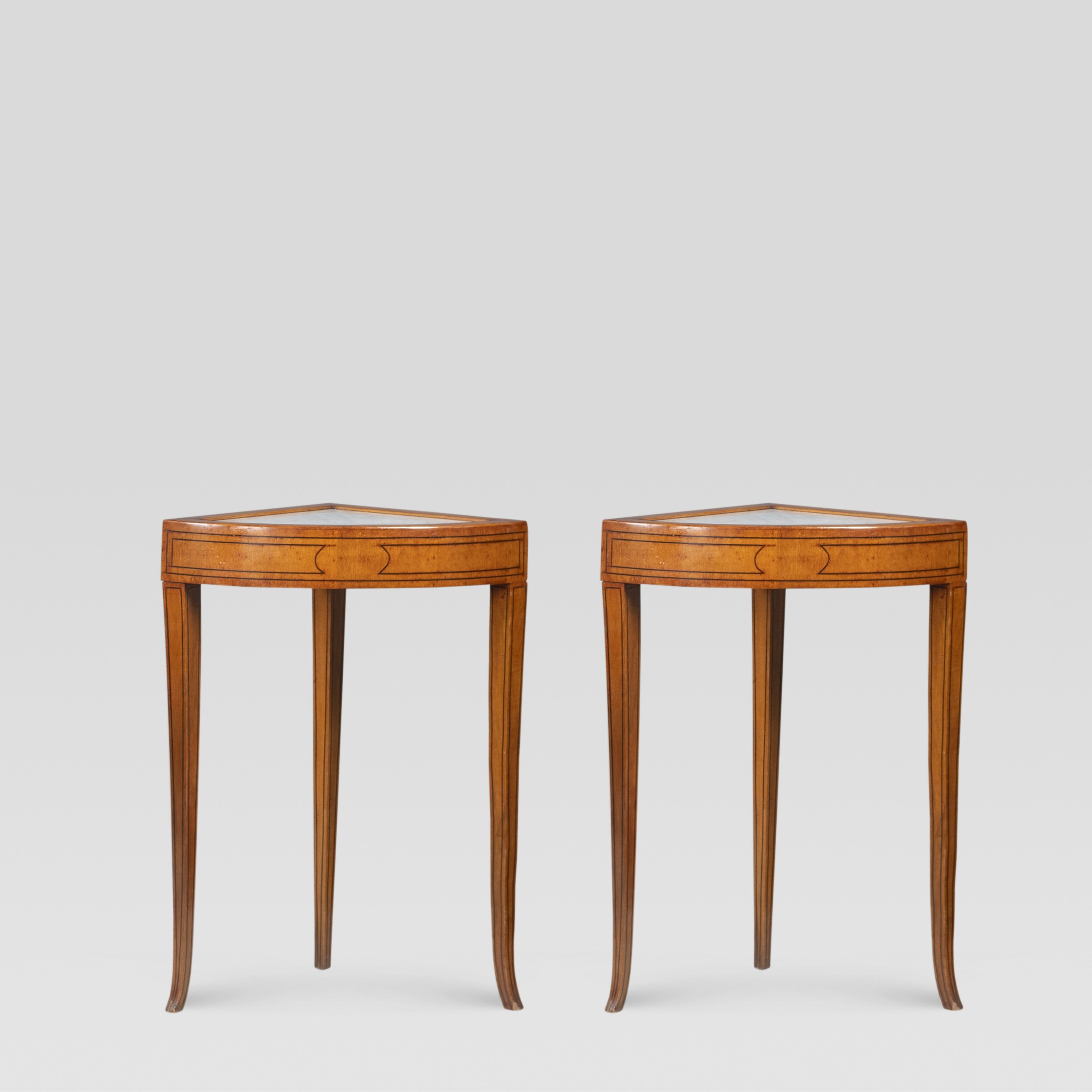 Italia, anni 50 coppia di consoles demilune in legno e marmo.
