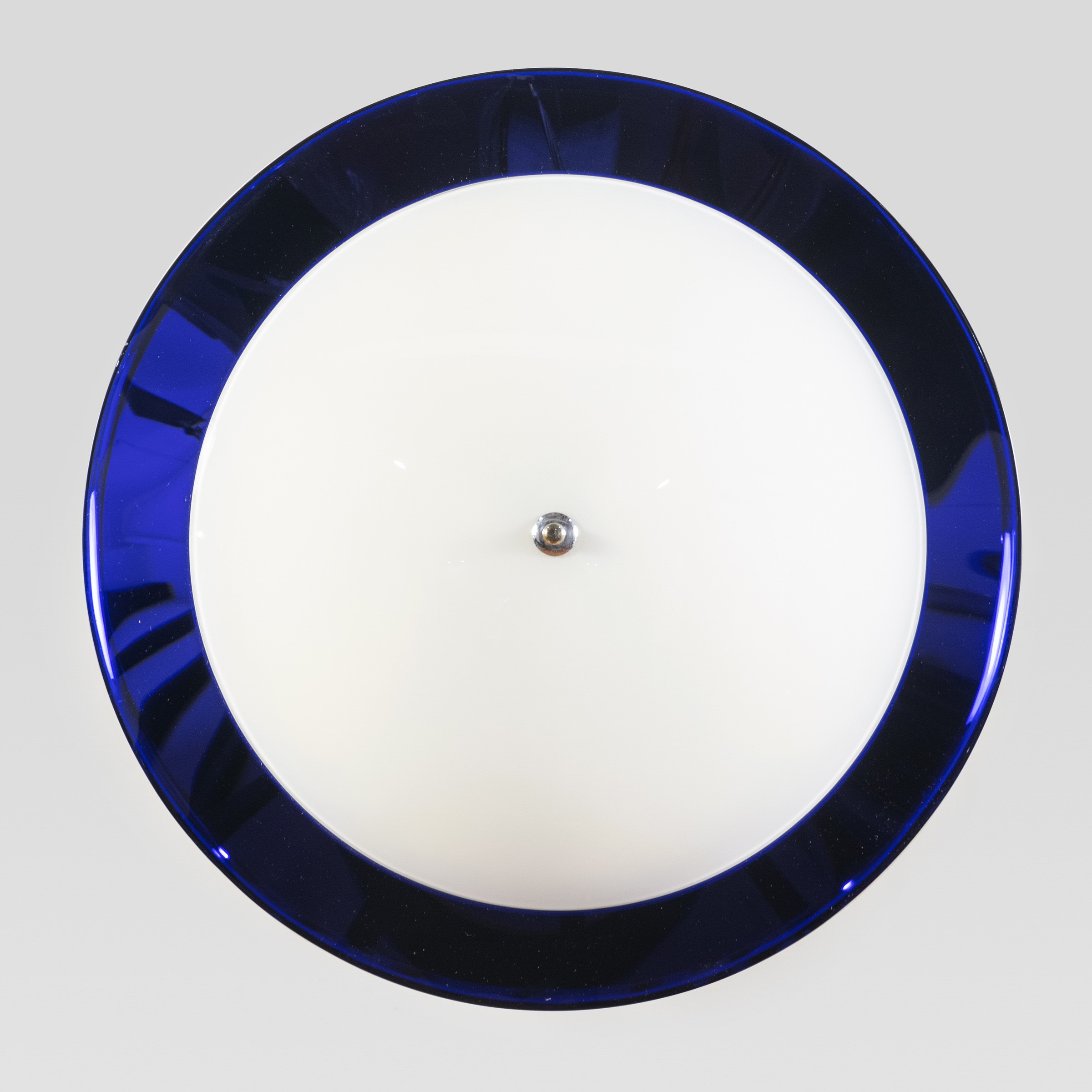 anni 60 lampada da parete o da soffitto, struttura in metallo, vetro blu e bianco opalino