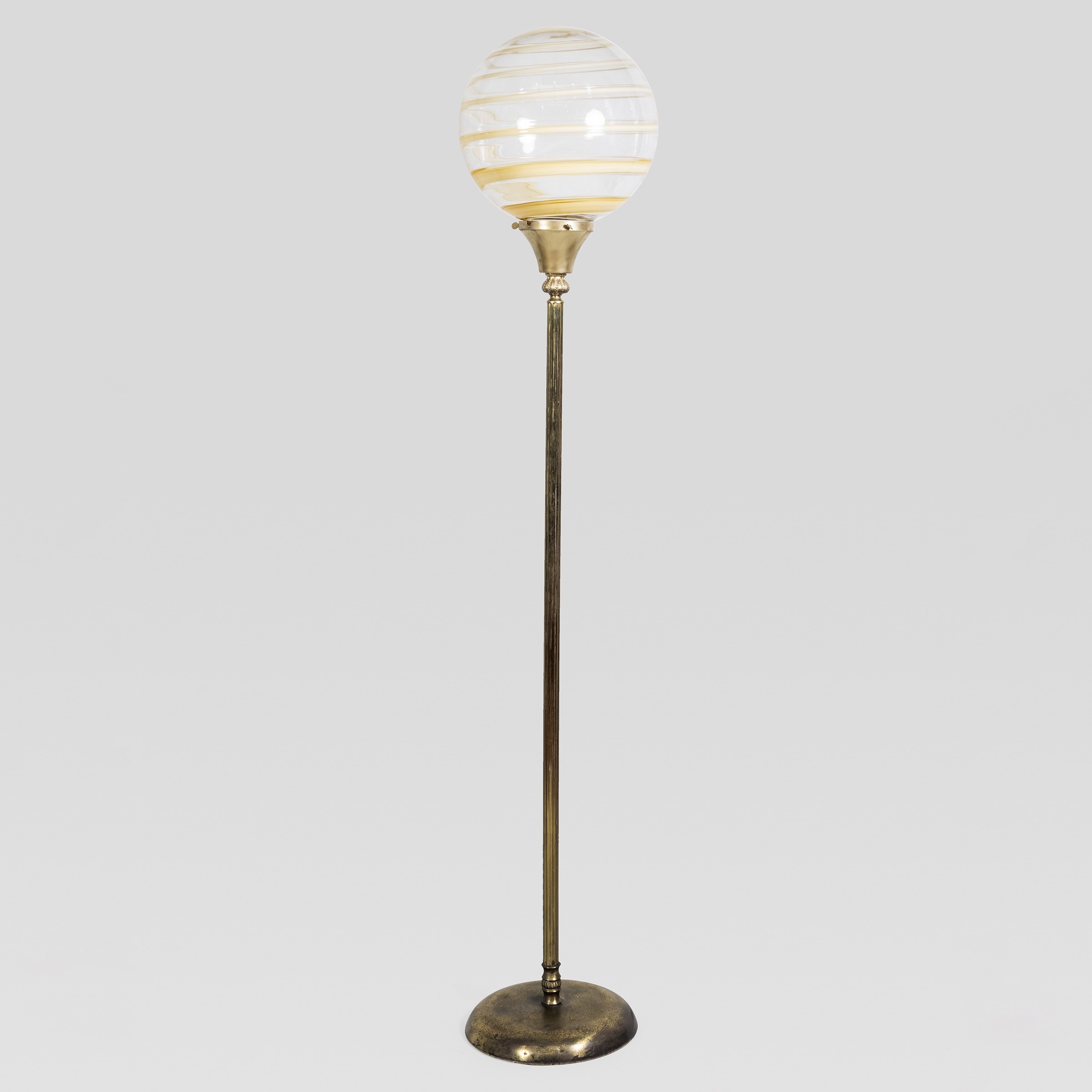 anni 60 lampada da terra in ottone con diffusore a sfera in vetro trasparente e colorato, difetti